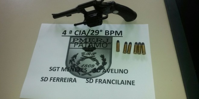Um revólver calibre 32 Taurus, com seis munições intactas, foi apreendido nesta segunda-feira (16), por policiais militares lotados na 4ª Companhia do 29º BPM. Os PMs receberam denúncia anônima, que indicava a existência da arma, no interior de um bar, na Rua Coronel Salgueiro, na região central da cidade. No local, o responsável pelo estabelecimento, o comerciante G.M.C., de 72 anos, confirmou a informação e voluntariamente entregou os artefatos, que foram apresentados ao plantão da 148ª Delegacia Legal de Italva, onde a ocorrência foi lavrada e o idoso liberado.