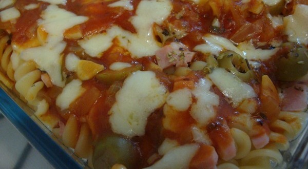 4. Em uma travessa coloque um fio de óleo e espalhe com um pincel ou com o dedo, coloque o macarrão cozido e jogue por cima o presunto, o frango, as azeitonas, o óregano e metade do queijo