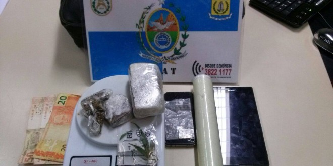 Os agentes já monitoram o endereço, quando notaram um rapaz em atitude suspeita sair do local. Este foi alvo de abordagem, com quem localizou-se um tablete de maconha, que ele admitiu ter comprado de Higor. Durante buscas no interior do imóvel, foram apreendidos 213 gramas de maconha, balança de precisão, R$ 120 em dinheiro, seis adesivos de êxtase, além de papel filme que é utilizado na endolação de entorpecentes (foto).