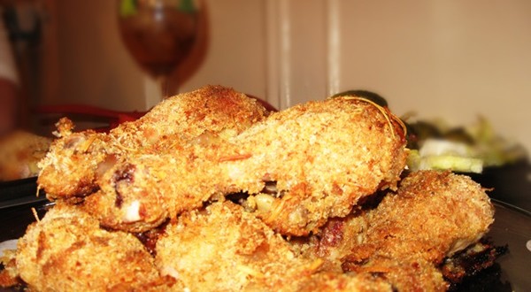 - Passe o frango, um a um, na farinha e coloque em uma forma