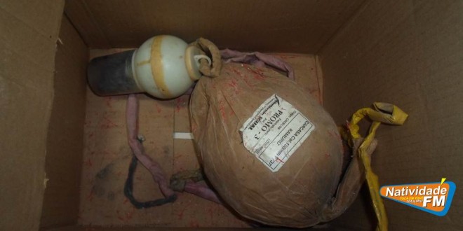 Dois artefatos supostamente explosivos foram encontrados abandonados no início da tarde desta quarta-feira (07), na Rua José de Lannes Dantas Brandão, no bairro Liberdade, Natividade. Um pedestre, que passava pelo local, encontrou o material ao lado de duas crianças que jogavam bola de gude, ao lado do antigo matadouro municipal e preocupado, ele acionou uma assistente social que trabalha no CAPS, que por sua vez, pediu ajuda ao policial militar Edson Clayton Gomes, que mesmo de folga, passou a acompanhar o caso e comunicou às demais autoridades.
