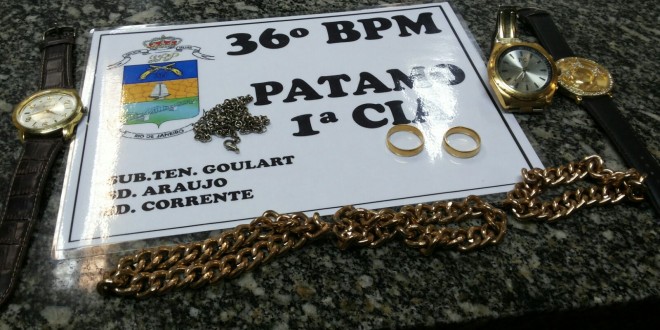 Um rapaz foi detido e levado até a 136ª Delegacia nesta quarta-feira (14), depois que policiais militares do 36º BPM encontraram diversos produtos supostamente furtados, no interior de sua residência, às margens da RJ 116, no bairro Trajano, Santo Antônio de Pádua. Os militares chegaram até o endereço após receberem denúncia anônima e com a autorização da tia do suspeito, realizaram busca no imóvel, onde localizaram três relógios, dois anéis, três pulseiras, um cordão e uma bicicleta, que possivelmente haviam sido furtados durante a festa de exposição da cidade. O desempregado Rondang Mendes Thomaz, de 25 anos, prestou depoimento na distrital, mas acabou liberado e a principio, responderá em liberdade.