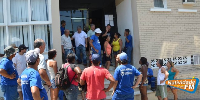 Com salários atrasados há cerca de duas semanas, parte dos cerca de 70 funcionários da companhia Veloz Tecnologia e Construção, terceirizada responsável pela limpeza urbana de Natividade, saíram em caminhada e se concentraram na manhã desta sexta-feira (16) em frente à sede da prefeitura, onde reivindicavam a quitação imediata de seus vencimentos.
