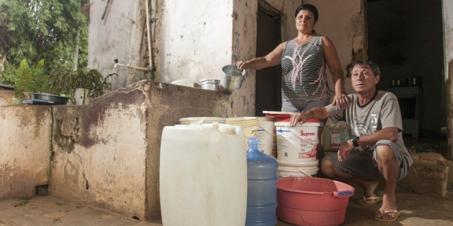 Um caminhão-pipa chega com água para abastecer a localidade, mas a quantidade de água não é suficiente para abastecer todas as casas. A dona de casa Genilda Teixeira Assis não conseguiu água do caminhão.