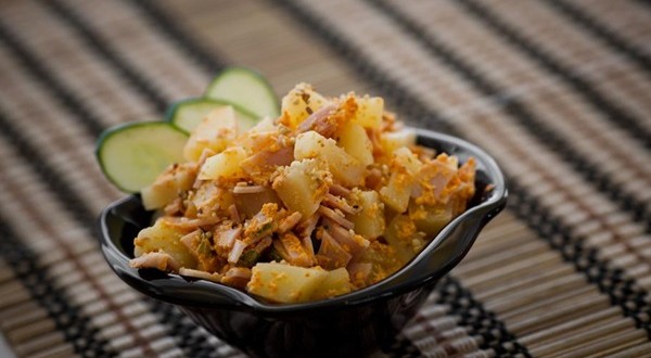 - Em uma saladeira ponha as batatas, o presunto e adicione o molho
