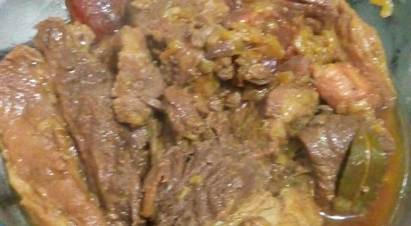 - Em uma panela de pressão coloque primeiro bacon, depois a cebola, a carne, bacon, caldo de carne e a folha de louro