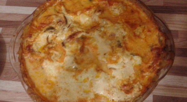 - Forre o fundo de um refratário com as batatas, os filés, os tomates, as cebolas e os pimentões