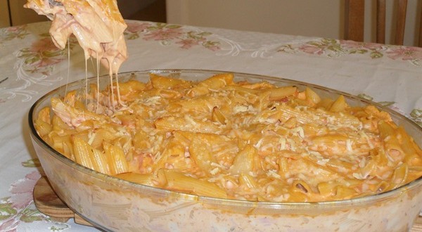 - Em um refratário coloque o macarrão, despeje o molho e polvilhe o queijo ralado