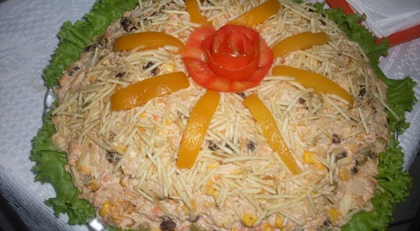 - Enquanto o frango cozinha, misture em um recipiente o milho, a ervilha, a cenoura e as uvas passas