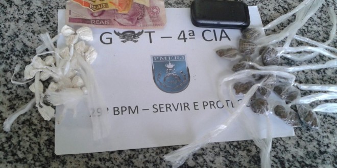 No veículo estavam o servente Luis Carlos Azevedo da Silva, de 21 anos e o lavrador Diego Moura Calixto, de 26. Após revista pessoal, os PMs encontraram dentro da bermuda no primeiro, uma sacola, com 18 sacolés de cocaína, 14 de maconha, além de R$ 29,90 em dinheiro. Os envolvidos admitiram ter comprado os entorpecentes por R$ 250,00 de um desconhecido que seria morador de Campos dos Goytacazes. Ambos seguiram para a 144ª Delegacia de Bom Jesus do Itabapoana, sendo autuados e recolhidos à Casa de Custódia de Itaperuna.