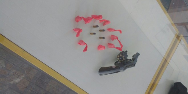Policiais militares lotados em Laje do Muriaé apreenderam durante a noite deste domingo (31), arma e drogas, no Morro do Querosene, área sob a influência do tráfico de entorpecentes em Laje do Muriaé. Os agentes realizavam patrulhamento de rotina pela comunidade, quando em uma escadaria que liga as ruas Orozimbo Ferreira Mateus a Compositor Henrique Pinheiro, avistaram dois suspeitos, que ao perceberem a presença da guarnição bateram em fuga, deixando supostamente para trás uma sacola plástica, na qual estava dez papelotes de cocaína, além de um revólver calibre 32 com 11 munições (foto). Um suspeito, identificado pelas iniciais F.H.A., de 28 anos, chegou a ser detido, mas durante depoimento na 138ª Delegacia negou ser o responsável pelo material, sendo liberado por falta de provas.