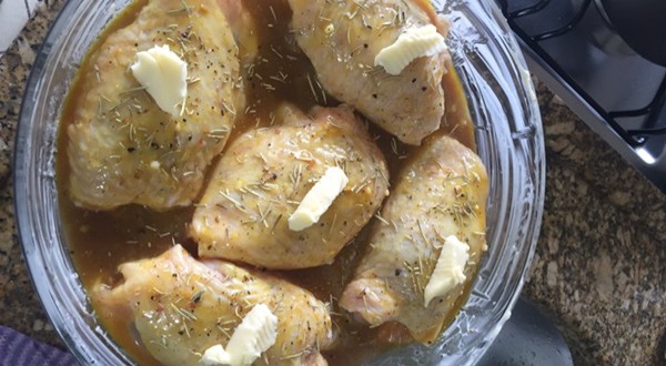 - Com o restante da margarina, coloque pedacinhos dela em cima de cada sobrecoxa