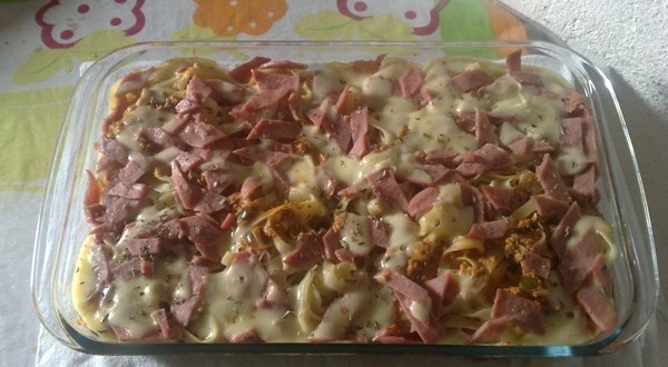 - Em uma travessa (retangular), espalhe parte do macarrão