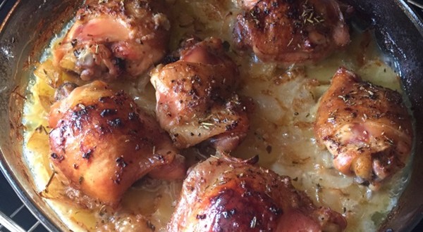 - Coloque as sobrecoxas temperadas sobre a camada de batatas e cebolas