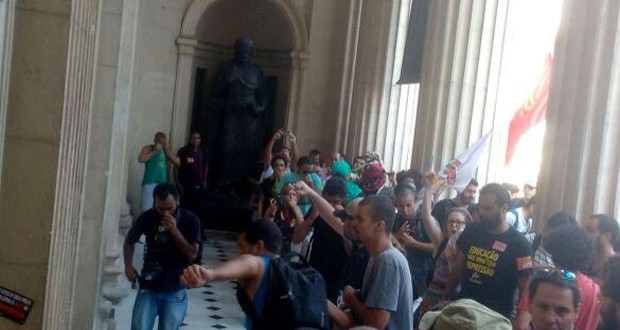 Um protesto de servidores estaduais da Educação terminou em confusão na porta da Assembleia Legislativa do Rio (Alerj), na tarde desta quarta-feira. Os manifestantes foram recebidos com spray de pimenta e seguranças da Casa fecharam as portas para impedir a entrada do grupo, que pretendia acompanhar a votação, em discussão única, de mudança na RioPrevidência. O protesto é contra as mudanças no regime previdenciário do estado. Os profissionais da Educação estão em greve. O governador em exercício, Francisco Dornelles, está reunido com o colégio de líderes da Alerj e presidente da Casa, Jorge Picciani.