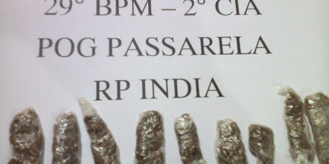 Com um deles, M.S.S.O., de 17 anos, os PMs encontraram uma sacola plástica com um rolo de pintura e camuflados dentro da ferramenta, nove buchas de maconha (foto), que ele alegou ter comprado dias antes de um traficante no território capixaba para consumo próprio e, que naquele momento, seguia para realizar a pintura num imóvel. O menor acrescentou que havia se esquecido de tirar a droga de onde havia escondido. O registro seguiu para a 144ª Delegacia e o infrator, autuado por posse de entorpecente e liberado.