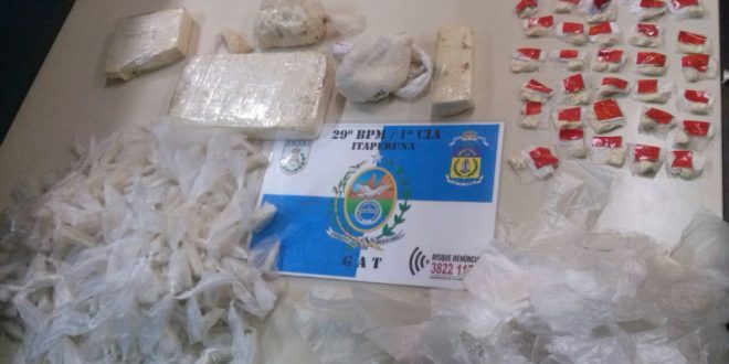 Três pessoas foram presas e grande quantidade de droga foi apreendida nesta sexta-feira (13), por policiais do 29º BPM em Itaperuna. Denúncia anônima levou os militares até o bairro Fiteiro, onde passaram a monitor Thiago Barros de Oliveira, de 22 anos, que estaria escondendo entorpecentes próximo à sua residência.