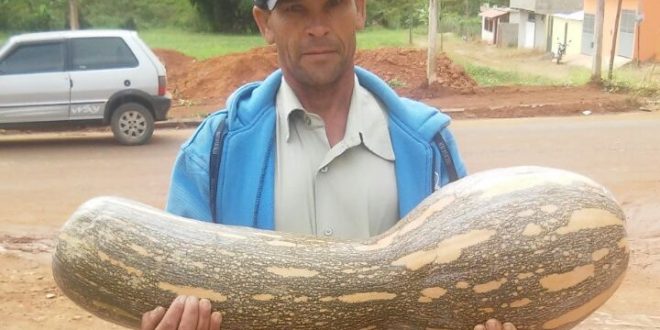 Um agricultor de Varre-Sai colheu nesta sexta-feira (20), uma abobora para lá de criada. Acostumado a plantar verduras e legumes no Sítio Pouso Alto, onde reside na zona rural do município, Roberto Marsola, se tornou a atração por onde passava exibindo o vegetal pelas ruas da cidade. E não faltaram fotos e perguntas curiosas sobre o cultivo, que ele jura de pé junto, que não teve nada de especial.