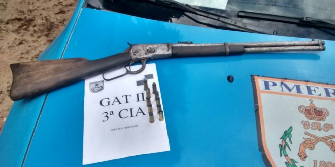 Policias militares do Grupamento de Ações Táticas (GAT – 3ª Cia), apreenderam uma arma de fogo no início da tarde desta sexta-feira (20), na zona rural de Natividade. Os agentes seguiram para a região da Revolta, onde havia denúncia de que caçadores estariam agindo naquela área. Após buscas, eles apreenderam uma espingarda Winchester calibre 44 com 10 munições intactas (foto). Um homem foi conduzido até a 140ª Delegacia, onde a ocorrência está sendo registrada.