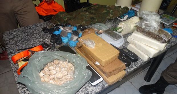 – 3 barras de pasta base de cocaína, mais 1 kg da droga pronta, somando aproximadamente quatro quilos; dois tabletes de crack, mais 32 pedras grandes da droga e 712 pedras pequenas; dois tabletes de maconha, além de sete porções grandes da erva prensada.