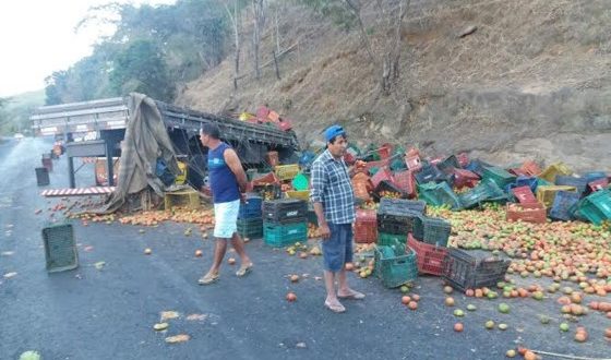 Caminhão carregado de tomates se acidenta na RJ 186 entre São José de Ubá e Pádua