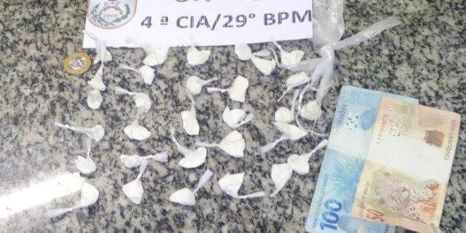 Policiais militares do 29º BPM prenderam um jovem acusado de tráfico de drogas na madrugada deste sábado (24), no município de Cardoso Moreira. Os agentes seguiram para a Rua Antônio Ferreira de Medeiros, próximo do estádio de futebol, onde avistaram Ludinei dos Santos Costa, de 18 anos, que por sua vez, ao perceber a aproximação da viatura, desfez de um frasco, com 30 papelotes de cocaína, os lançando sobre o teto um ônibus, estacionado próximo.