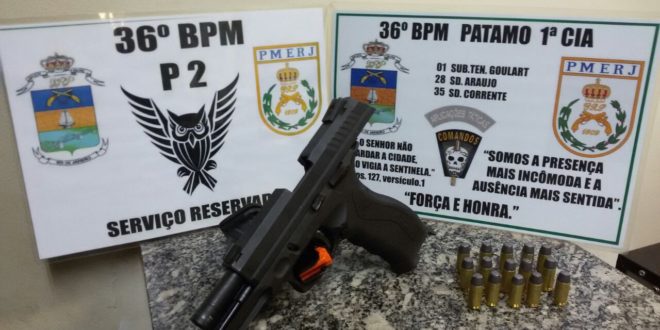 Graças à denúncia anônima, militares do 36º BPM apreenderam uma arma de uso restrito das forças de segurança pública (polícias Civil e Militar), na noite desta sexta-feira (14), em Aperibé. A pistola Taurus calibre .40, com carregador e 16 munições (foto), estava sob o poder de Willian Rodrigues de Araújo, de 30 anos. O rapaz estava no interior de uma das casas do conjunto habitacional, no bairro Ponte Seca. De acordo com as autoridades, o rapaz que seria integrante de uma facção criminosa, que comanda o tráfico de drogas naquela área, foi levado ao plantão de área da 137ª Delegacia de Miracema, autuado em flagrante e transferido na manhã deste sábado (15), para a Casa de Custódia de Itaperuna.