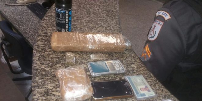 Mais de um quilo de entorpecentes foram apreendidos e um suspeito preso, no final da noite desta segunda-feira (12), no bairro Vinhosa, Itaperuna. Os militares já investigavam o homem de 35 anos, que não teve a identidade revelada, quando o abordaram na condução da moto Honda CG 150, de cor vermelha, pela Rua Vinhosa. Com ele, estavam três pequenos tabletes da erva, telefone celular e R$ 70. Já após revista no interior de sua residência, os agentes localizaram outras duas porções maiores do entorpecente, balança de precisão e material para endolação (foto). Levado até o plantão da 143ª Delegacia acabou autuado em flagrante e transferido na manhã de hoje para a Casa de Custódia da cidade, onde aguardará decisão da justiça.