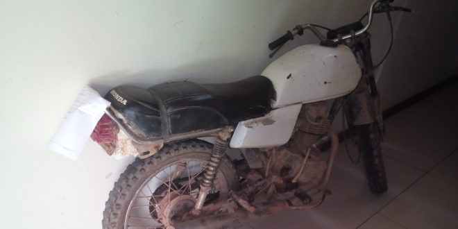 Uma moto Honda CG 125 Titan, de cor branca sem placa (foto), que constava nos cadastros de roubos/furtos, foi recuperada no final da manhã desta segunda-feira (06), por militares do 29º BPM, na zona rural de Varre-Sai. Denúncia de que o veículo se encontrava há cerca de cinco dias abandoando às margens da RJ 214, na altura do horto municipal, levou a guarnição composta pelo sargento Conde e cabo Serafim até o local, onde verificaram os dados do chassi e com o auxílio da Defesa Civil Municipal, removeram a moto até a 140ª Delegacia de Natividade, onde permaneceu apreendida para a realização de perícia.