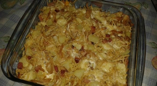 - Em uma vasilha, misture o frango, o bacon, o queijo e a batata palha