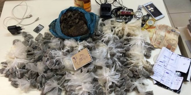 Dois adolescentes foram detidos e grande quantidade de maconha apreendida, durante a tarde desta segunda-feira (02), na Rua São João Batista, no bairro Tavares, Santo Antônio de Pádua. Várias equipes do 36º BPM realizaram incursão na área, conhecida por sofrer influência do tráfico de drogas onde abordaram J.E.S.A. e M.V.B., ambos de 16 anos, encontrando com eles, cerca de 400 buchas de maconha, já prontas para venda, outros 500 gramas da erva, ainda sem endolação, R$ 370,00 em dinheiro, três relógios, quatro celulares, um carregador de radiotransmissor com fone de ouvido, soco inglês, além de caderno com a contabilidade do tráfico (fotos). A dupla seguiu para a 136ª Delegacia, onde acabou autuado e até o fechamento desta matéria, aguardava apresentação ao Ministério Público.