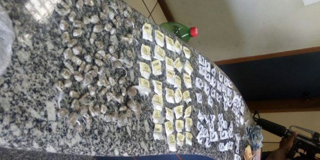 Policiais militares do 36º BPM detiveram neste domingo (29), o adolescente L.A.G.F., de 17 anos, com quem apreenderam drogas e dinheiro em um das comunidades de Miracema. Os agentes realizavam patrulhamento de rotina pelo Morro do Cruzeiro, quando viram o rapaz saindo de um terreno, o abordaram e encontraram em seu poder, 90 buchas de maconha, 86 papelotes de cocaína e R$ 66,00 em dinheiro. Levado até a 137ª Delegacia, o infrator foi autuado em flagrante por crime análogo ao tráfico de drogas, apresentado ao Ministério Público, devendo ser transferido à unidade socioeducativa de Campos dos Goytacazes.