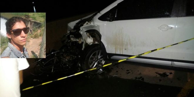 O motociclista Palmiere Fraga Bastos, de 27 anos (detalhe), morreu após a moto que pilotava ter se chocado de frente contra um táxi, no final da noite deste sábado (04), sobre a ponte Ary Parreiras, que liga os municípios de Aperibé e Itaocara. De acordo com testemunhas, a vítima teria tentado realizar uma ultrapassagem, quando se deu o impacto e ele morreu na hora, antes mesmo da chegada do resgate dos bombeiros. No táxi, ninguém se feriu. O trânsito chegou a ser interrompido nos dois sentidos da pista, mas acabou liberado no sistema pare e siga. O corpo da vítima passou por perícia e foi removido ao IML de Itaperuna.