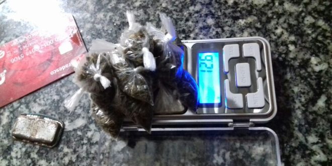 Ação de combate ao tráfico de drogas deflagrada por militares do 29º BPM terminou com a apreensão de maconha e a prisão de um suspeito, no final da noite desta segunda-feira (20), no bairro Cantinho do Fiorello, Natividade. De posse de denúncia, os agentes do Grupamento de Ações Táticas, com o apoio do DPO local, passaram a monitorar o ajudante de pedreiro Samuel Gomes da Rocha, de 22 anos, encontrando após buscas no interior de sua residência (em um dos imóveis da prefeitura invadidos ano passado), 12 trouxinhas e um pequeno tablete da erva, totalizando 27 gramas da substância, balança de precisão e material para endolação. Levado para a 140ª Delegacia, o suspeito foi autuado pelo delegado Gésner César Bruno, devendo ser transferido na manhã desta terça-feira (21), para a Casa de Custódia de Itaperuna.