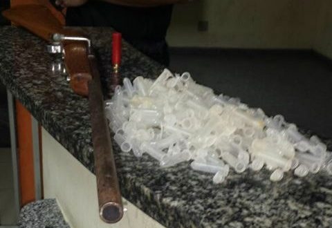 Militares do Patrulhamento Tático Móvel (PATAMO) da 2ª Companhia do 29ª BPM apreenderam uma espingarda calibre 28 durante o início da noite deste domingo (19), em Bom Jesus do Itabapoana. Os agentes realizavam incursão no bairro Monte Calvário, quando avistaram três elementos suspeitos na Rua Papa João XXIII, que ao perceberem a aproximação da viatura, bateram em fuga em direção a um matagal, deixando para trás a arma municiada junto ao meio-fio. Durante as buscas, também foram apreendidos no interior de um imóvel abandonado, 179 pinos plásticos vazios (foto), geralmente usados para embalar cocaína. Os suspeitos não foram identificados e registro, seguiu para a 144ª Delegacia.