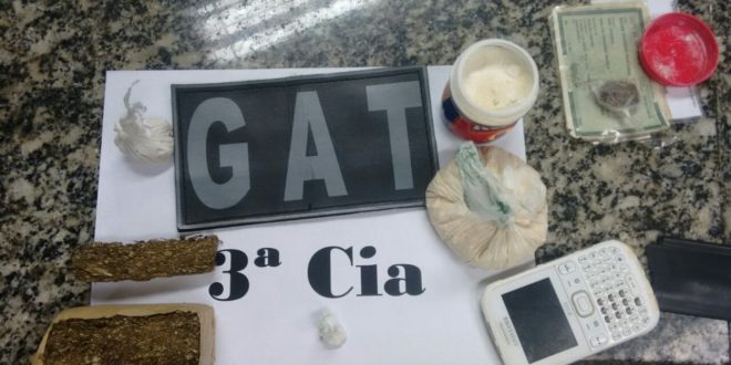 Quase 350 gramas de entorpecentes foram apreendidas e um jovem acabou preso na noite desta terça-feira (04), no município de Porciúncula. A equipe do Grupamento de Ações Táticas (GAT) – composta pelos sargentos Teixeira e Ronei, além dos cabos Prevato e Eduardo – realizava patrulhamento de rotina pela RJ 230 (Bate-Pau), quando abordaram o adolescente D.S.A., de 16 anos, encontrado escondido em seu chinelo, uma bucha de maconha, que ele admitiu ter comprado instantes antes por R$ 10, de Bruno Pacheco Portugal, de 23.