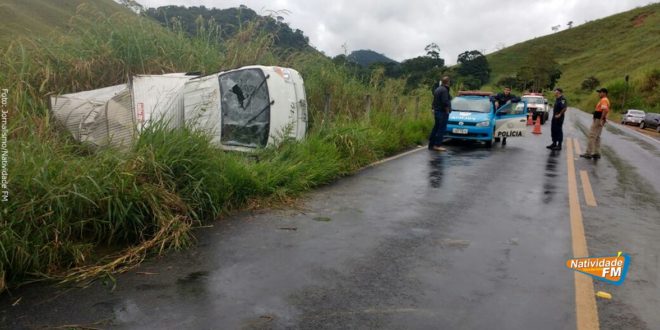 Um motorista ficou levemente ferido após o pequeno caminhão do tipo baú que conduzia, tombar na tarde desta sexta-feira (19), na RJ 214, quase no limite entre os municípios de Natividade e Varre-Sai. Chovia no momento do acidente quando o veículo teria “aquaplanado”,saído e pista, próximo da localidade da Mutuca. Ele foi removido com pequenos arranhões ao pronto socorro de Varre-Sai e passa bem. Guardas municipais, policiais militares e bombeiros do destacamento 4/21 de Natividade estão no local.