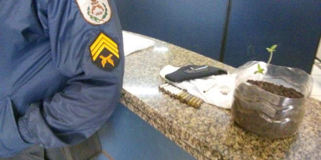 Um agentes penitenciário de Minas Gerais e o filho, foram detidos na manhã desta quarta-feira (12), no terminal rodoviário de Itaperuna. Policiais militares do 29º BPM verificavam a denúncia de que elemento estaria transportando drogas e munições, quando abordaram B.G.S., de 22 anos, no momento em que desembarcava de ônibus que havia acabado de chegar do Rio de Janeiro, encontrando com ele, 13 munições de calibre 38, coldre vazio, cigarro, bucha, além de um vaso com duas mudas de maconha.