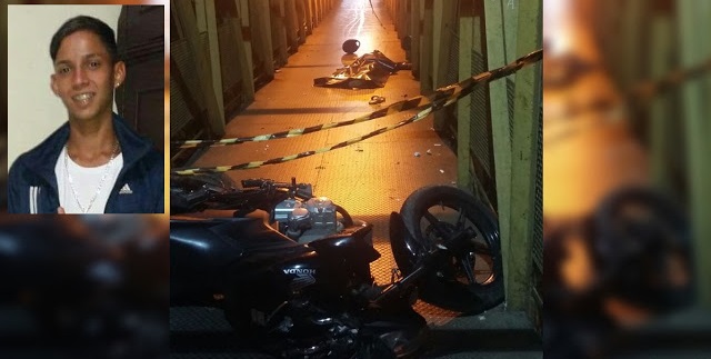 Um jovem de 18 anos morreu durante o acidente com uma moto por volta das 3h da madrugada deste sábado (09) na passarela sobre o Rio Pomba que liga os bairros Farol e Gerador, em Santo Antônio de Pádua. Segundo informações da Polícia Civil, Diego Silva de Castro (detalhe na foto) teria pegado a motocicleta, modelo CB 300, próximo ao Centro, e ao passar pela ponte acabou se acidentando. O Corpo de Bombeiros chegou a ser acionado, mas o jovem morreu na hora.