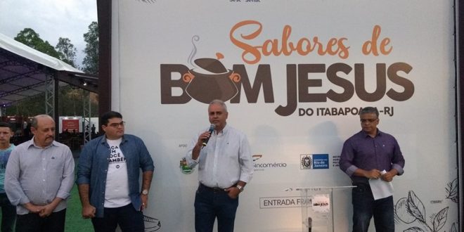 O secretário estadual de Agricultura, Pecuária, Pesca e Abastecimento, Jair Bittencourt participou do festival do festival gastronômico “Sabores de Bom Jesus”, que aconteceu entre os dias 27 e 29 no parque de exposições de Bom Jesus de Itabapoana. Na ocasião estiveram presentes ao evento o diretor da Fecomércio, Edmilson Ladeira; o diretor do Sincomércio, Clébio Damas; o prefeito de Bom Jesus do Itabapoana, Roberto Tatu com secretários municipais da agricultura, Evaldo Gonçalves; de obras, Paulo Vinícius Borges; da saúde, Pedro Renato Baptista; da cultura, Luciara Nunes; e os vereadores do município, Sérgio Crizostomo, José Luiz Rezende e Fabrício Cadei.