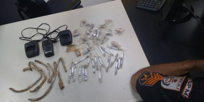 No início da tarde desta terça-feira (28), alertados por moradores que mantiveram contanto com o telefone de emergência 190, denunciando o movimento de traficantes no Morro da Faca, parte alta do bairro Aeroporto, militares do 29º BPM, seguiram para o endereço indicado onde após buscas em um dos terrenos às margens da Rua Tenente José Pillar, encontraram sob algumas pedras 45 buchas e cigarros de maconha, além de um radiotransmissor com dois carregadores (foto).