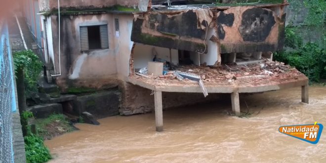 Outra parte de uma residência interditada no final da tarde de ontem, desabou na madrugada desta terça-feira (05), na área central de Natividade. A laje do imóvel, ao lado da Passarela Padre Afonso Egídio Huber, que liga o Centro de Natividade ao bairro Liberdade, que já estava desabitado desabou com a chuva de horas atrás. Ninguém de feriu.