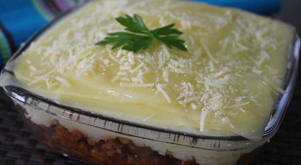 - Quando estiver pronto, é só montar no pirex na seguinte ordem: o purê de batatas, a carne moída, o purê de batatas e assim sucessivamente até terminar com uma camada de purê