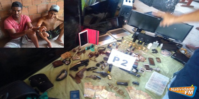 Em ação rápida, agentes do Serviço Reservado do 8º BPM prenderam na manhã deste domingo (21), dois dos quatro suspeitos de terem invadido a residência de uma família no final da noite de ontem, em Natividade. Os dois elementos, cuja as identidades ainda não foram confirmadas, foram encontrados com a caminhonete da vítima, na localidade de Parque Aurora, Campos dos Goytacazes. Com eles, policiais ainda encontraram joias, computadores e celulares, levados das vítimas, além de três armas.