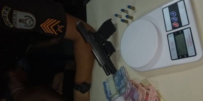 O crime aconteceu no bairro Viradouro, onde o menor acabou atingido nas pernas, sendo removido ao pronto Socorro Municipal, onde recebeu atendimento e não corre risco de morte. Militares do 36º BPM passaram a realizar buscas e graças a uma denúncia anônima, localizaram o envolvido que levava consigo uma pistola .40 de uso restrito com cinco munições intactas, além de uma balança de precisão e dinheiro (foto).