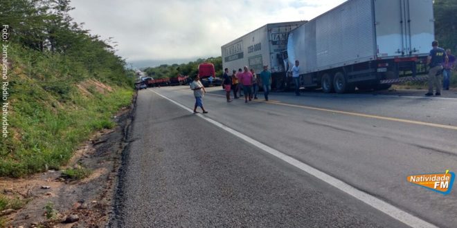 Um grave acidente envolvendo três caminhões, deixou pelo menos dois mortos na manhã desta sexta-feira (16), na BR 116, na altura do município de Cândido Sales, no interior da Bahia. Ainda não há informações precisas sobre o que teria causado o desastre, mas de acordo com o apurado pelo jornalismo da Rádio Natividade, entre as vítimas fatais, estaria o motorista natividadense Jorge Luiz Sores de Souza, o Jorginho, de 59 anos, residente no bairro Morada do Engenho. Ele dirigia um Ford Cargo do tipo baú e morreu na hora.