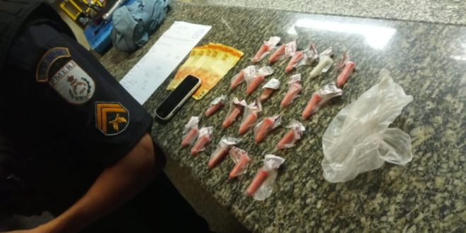 No início da noite desta quarta-feira (06), militares do 29º BPM que verificavam denúncia de tráfico de drogas no bairro Carulas, Itaperuna, prenderam Luiz Antônio Soares, de 38 anos. Os agentes já monitoravam o suspeito, flagrado escondendo o entorpecente em local da Rua Paulo de Oliveira, onde após buscas foram encontrados 20 pinos de cocaína com a inscrição de uma facção criminosa, que seriam comercializados a R$ 20 cada. Com o rapaz, ainda estavam R$ 100 e celular. O envolvido seguiu detido até a 143ª Delegacia, sendo lá autuado, devendo ser transferido ao sistema prisional.