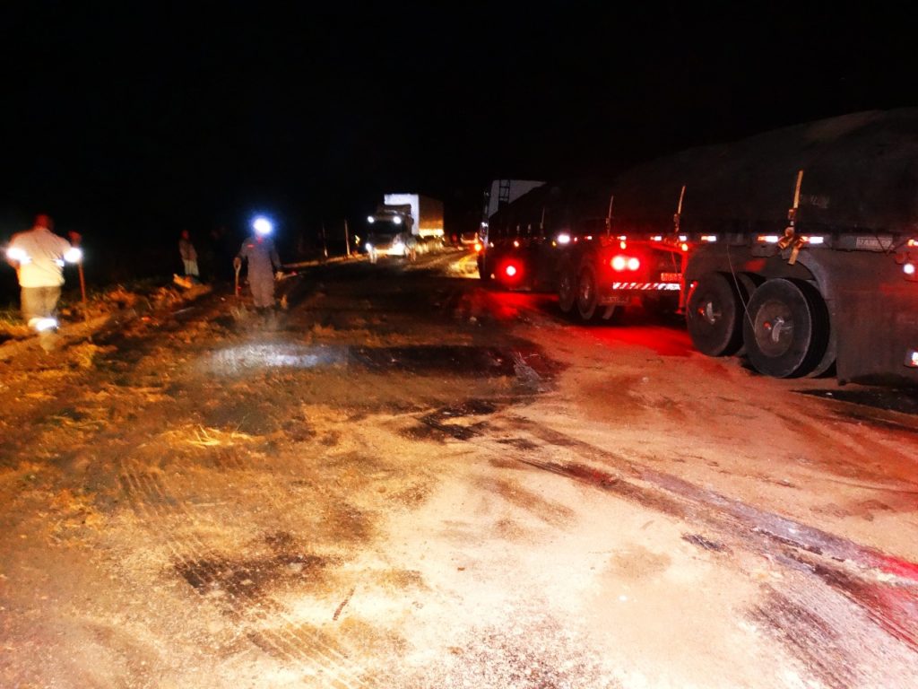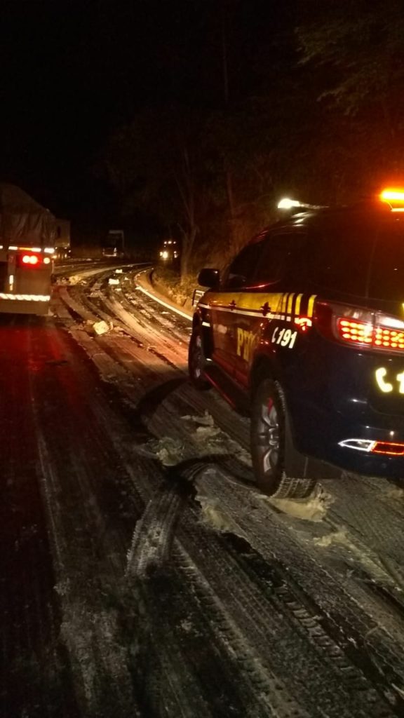 Com isso, a pista está escorregadia, chegando a provocar o tombamento de um veículo da Prefeitura de Divino (MG). A PRF que com auxílio de bombeiros está aplicado serragem na via, solicita atenção redobrada e que se trafegue em baixa velocidade.