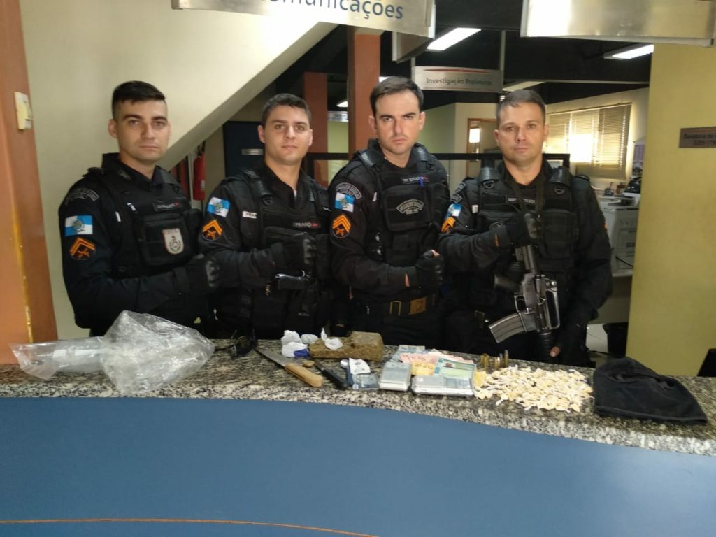De posse de denúncia anônima, militares do Patrulhamento Tático Móvel (PATAMO), sargentos Prevato/Eduardo e cabos Marquioti/França, com apoio do setor “Tango”, da 3ª Companhia do 29º BPM conseguiram apreender farta quantidade de drogas na manhã desta quinta-feira (23), Rua Deputado Luiz Fernando Linhares, na área central de Porciúncula.