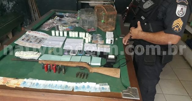 Na Rua Eusébio de Souza Filho, após buscas, além do material da contravenção – seis talões de pules, um impressora, um carregador de impressora, seis celulares, quatro cadernos de anotações e calendário e sete bobinas de impressora – os PMs apreenderam R$ 3.460,00 em espécie, cigarros paraguaios da marca Gift, dois pássaros coleiros sem registro, 65 DVDs piratas, um espingarda Cal. 38, 10 munições cal. 38 intactas, duas cal. 38 deflagradas, sete cal. 28 intactas e outras quatro munições cal. 28 deflagradas.